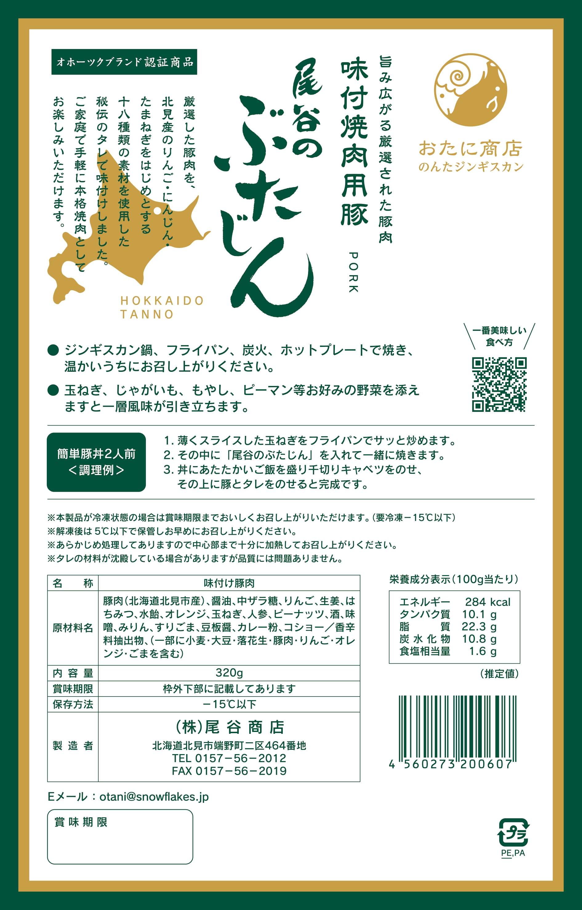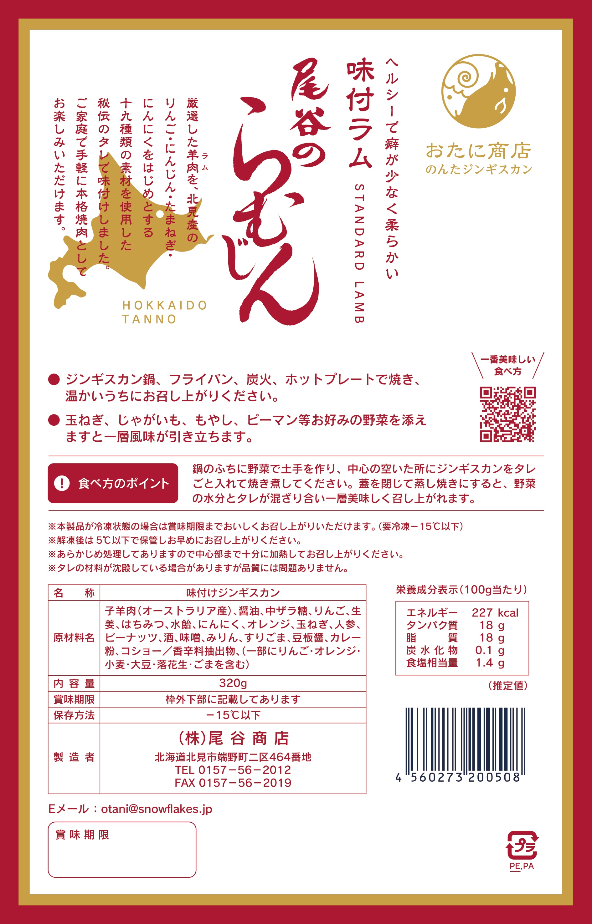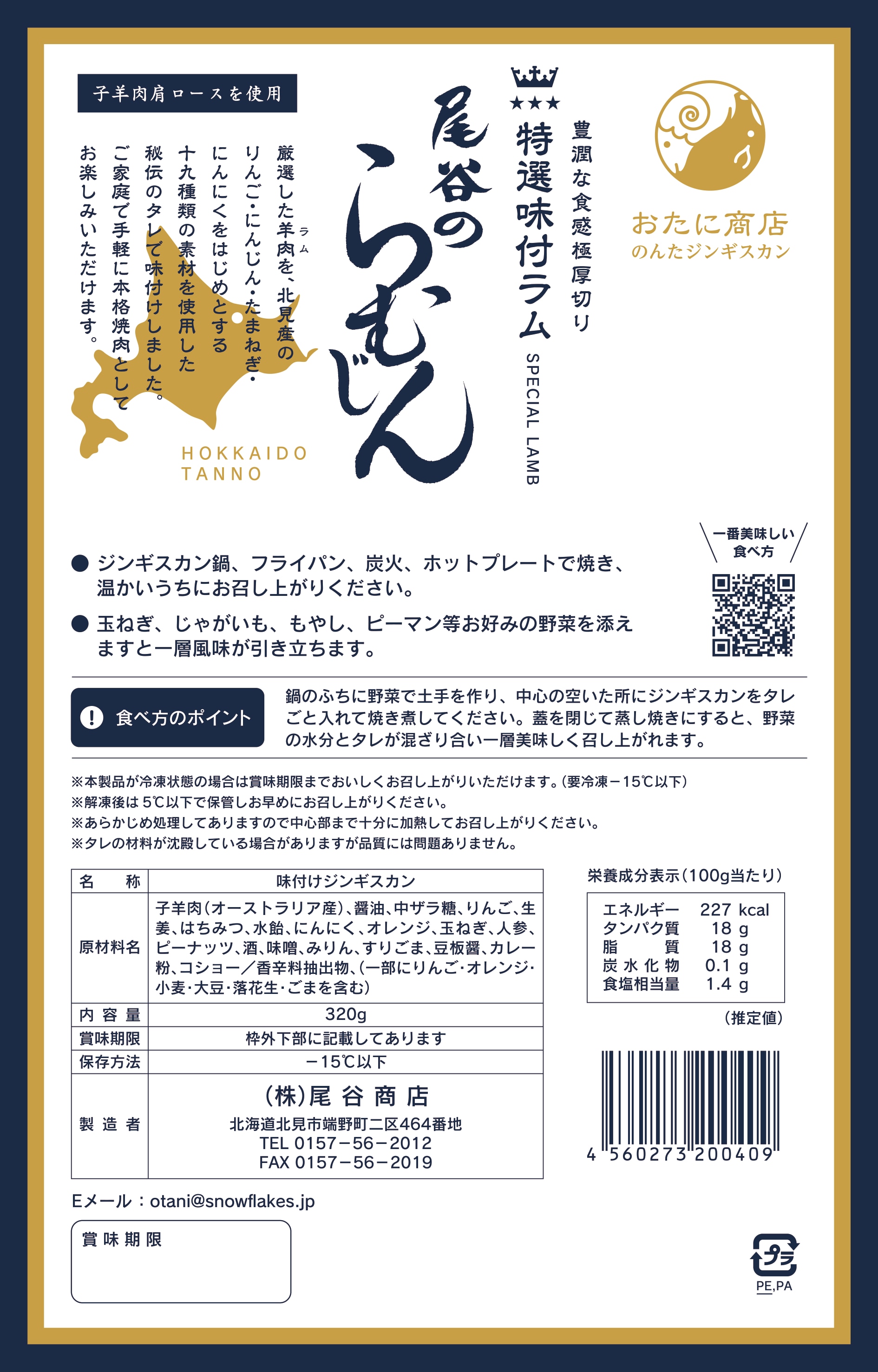 株式会社尾谷商店様が製造し、販売するジンギスカン「らむじん特選味付けラム」が、2025年度の味付けジンギスカングランプリで準グランプリを受賞しました。厳選した羊肉を、北見産のりんご・にんじん・たまねぎ・にんにくをはじめとする十九種類の素材を使用した秘伝のタレで味付けしたこだわりのジンギスカンです。