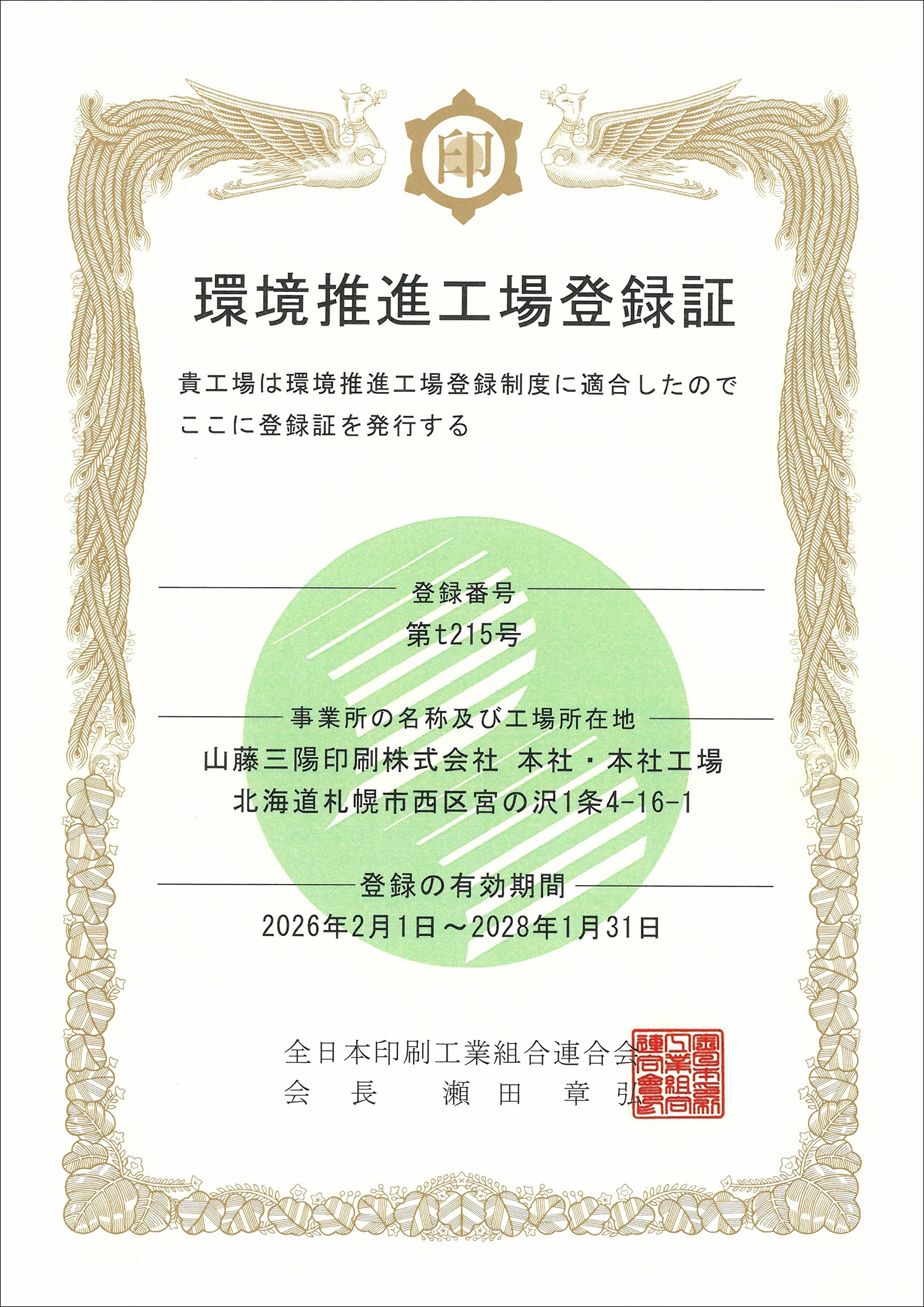 山藤三陽印刷株式会社は、全日本印刷工業組合連合会および東京都印刷工業組合が運営する 「環境推進工場登録制度」において、2026年2月1日付で「環境推進工場」として認定登録されましたので、 お知らせいたします。