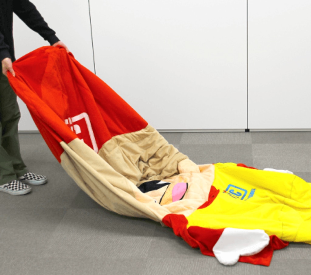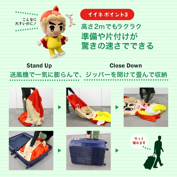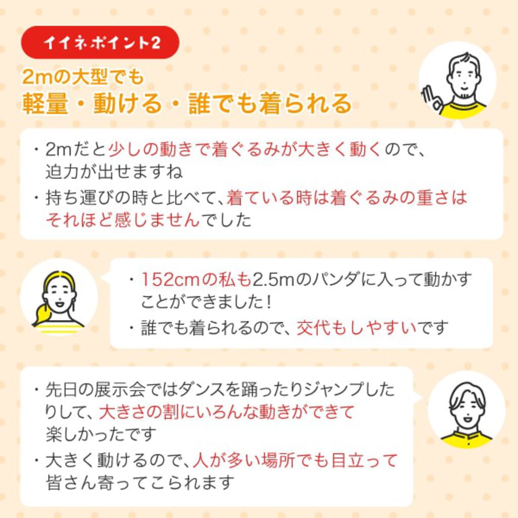 2mの大型サイズでも軽量で動きやすく、男女や体格に関係なく着用でき、従来の着ぐるみに比べて着用者の負担が大幅に軽減されるのが特長です。