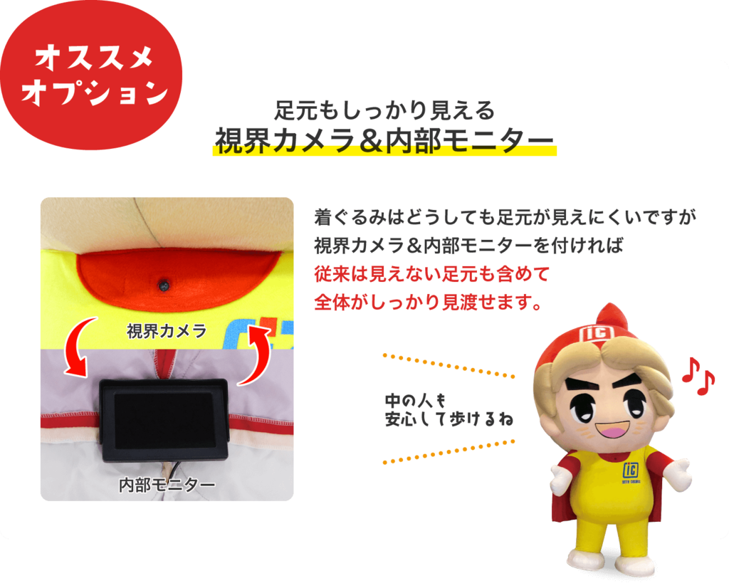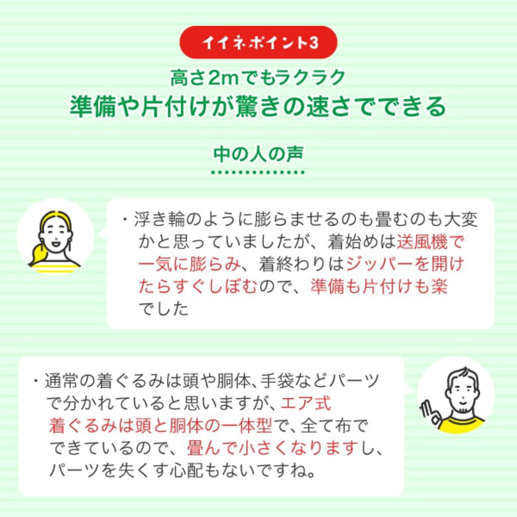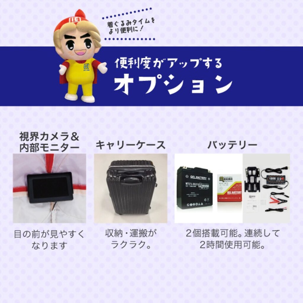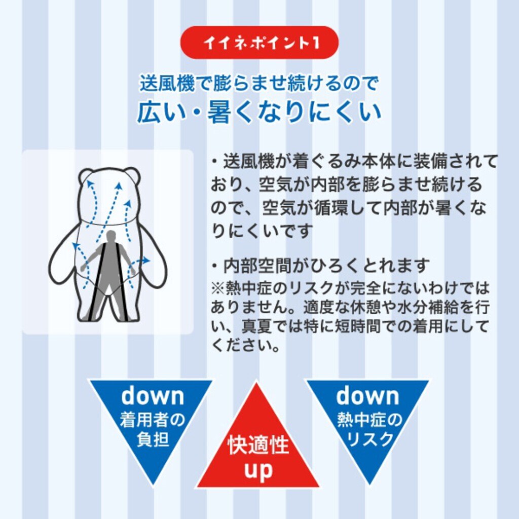 | 備考 | 屋内専用 ※エア式着ぐるみでは熱中症のリスクが完全になくなるわけではありません。 適度な休憩や水分補給を行い、真夏では特に短時間での着用にしてください。 |