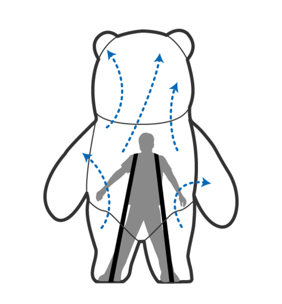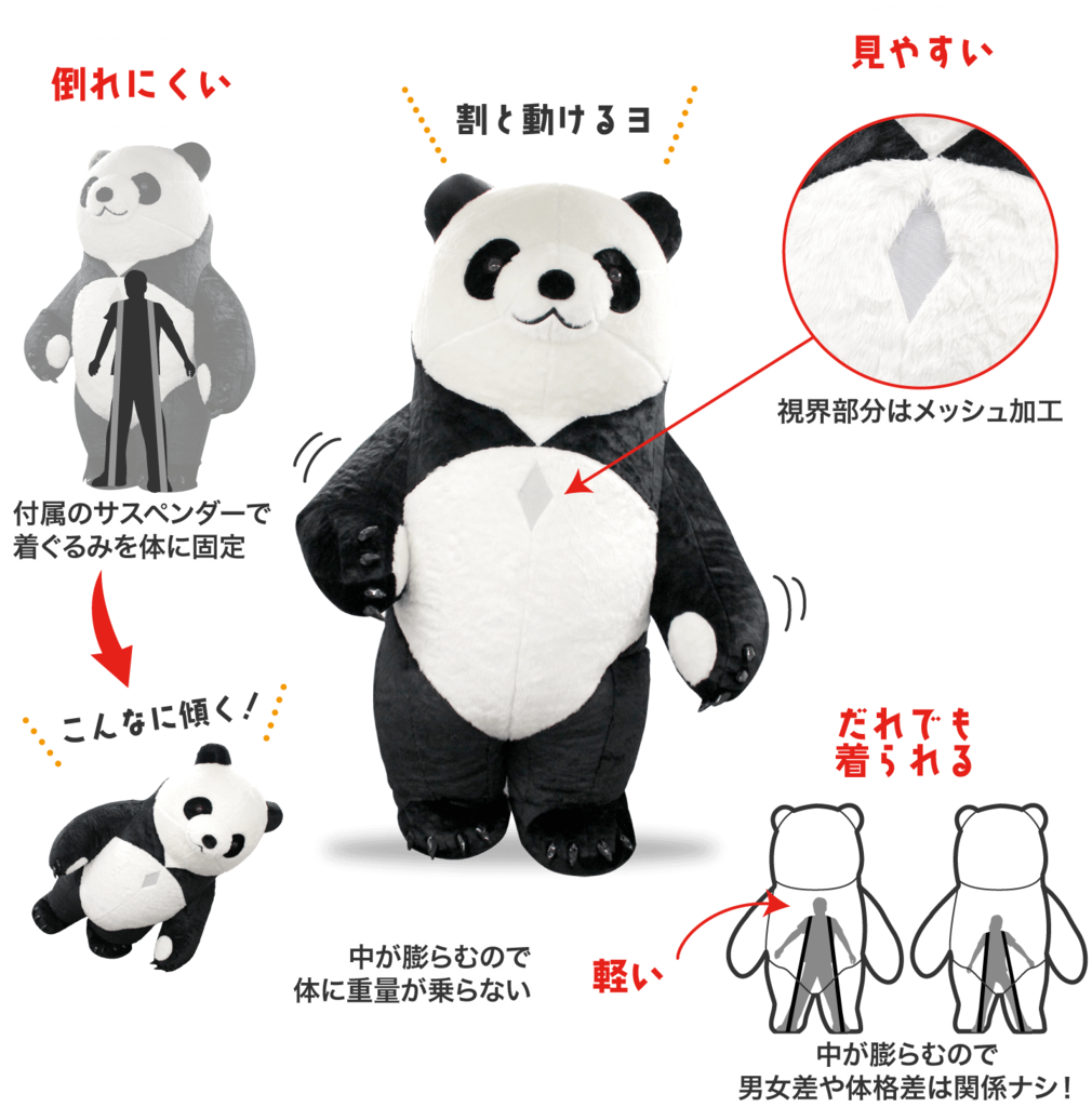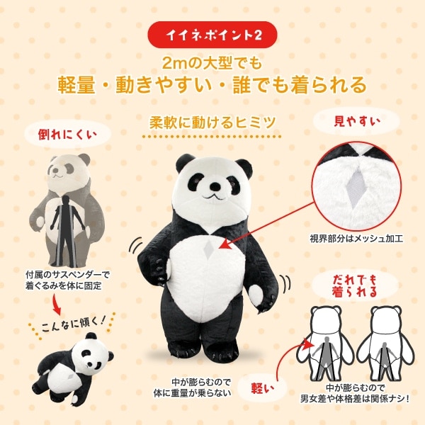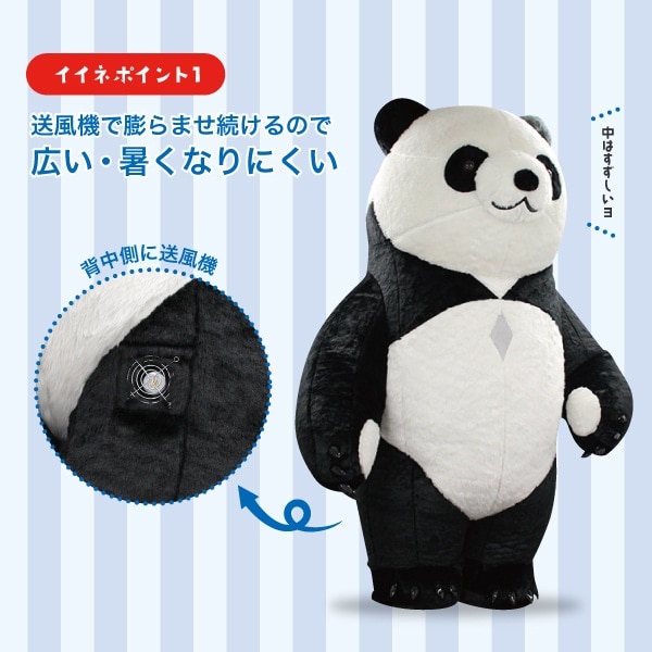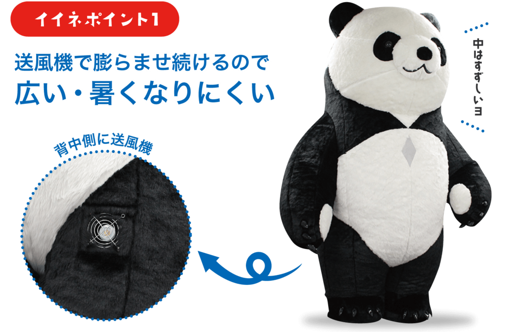 送風機で中を膨らませるエア式着ぐるみは、内部が広く熱がこもりにくいため快適に着用できます。