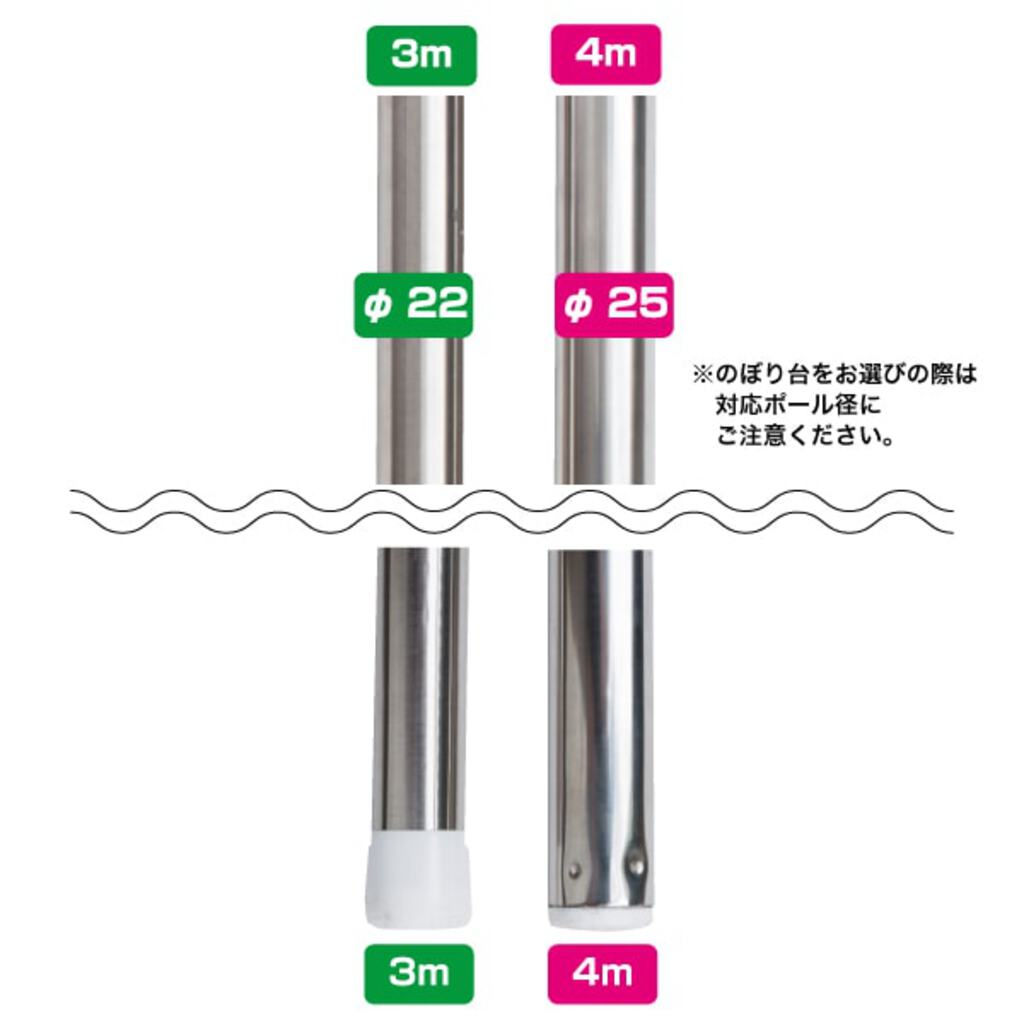 サイズは3mと4mの2種類をご用意。 横棒は本体内部に収納可能で、使わないときはポール内に収納できます(上部キャップを外して取り出します)。