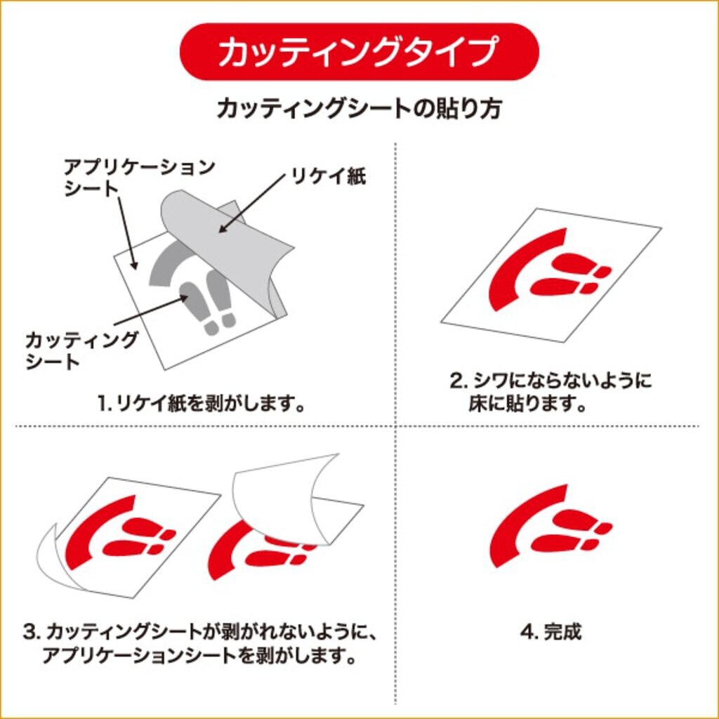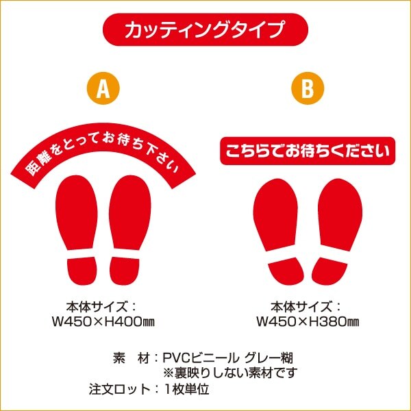 ウイルス対策ツール・床シートシリーズ。 間隔をあけて並んでいただくために効果的な、床に貼れるカッティングシートです。 裏映りしない素材で、デザインは2種あります。