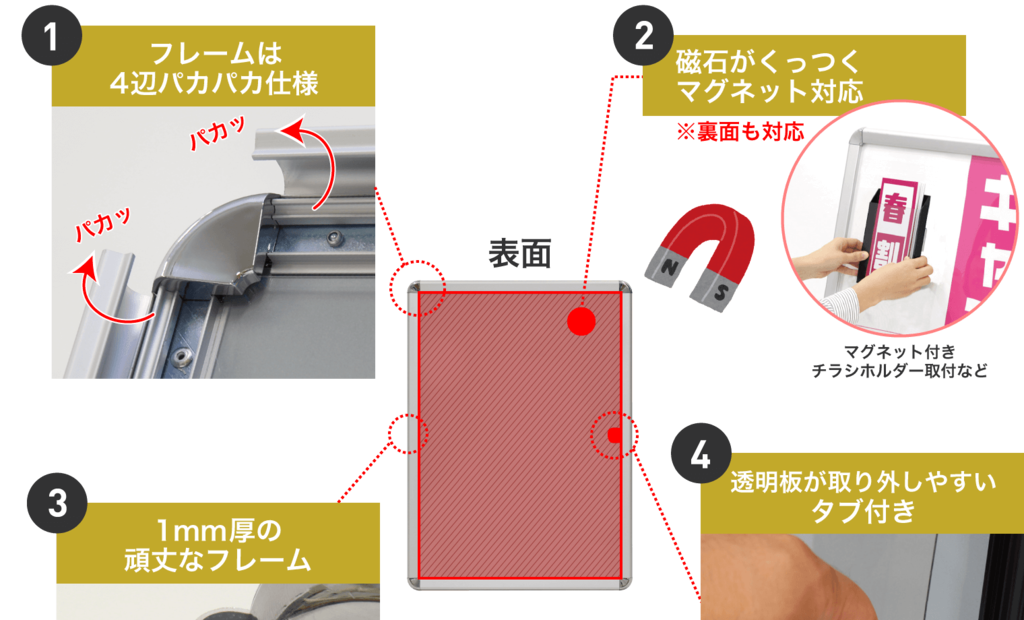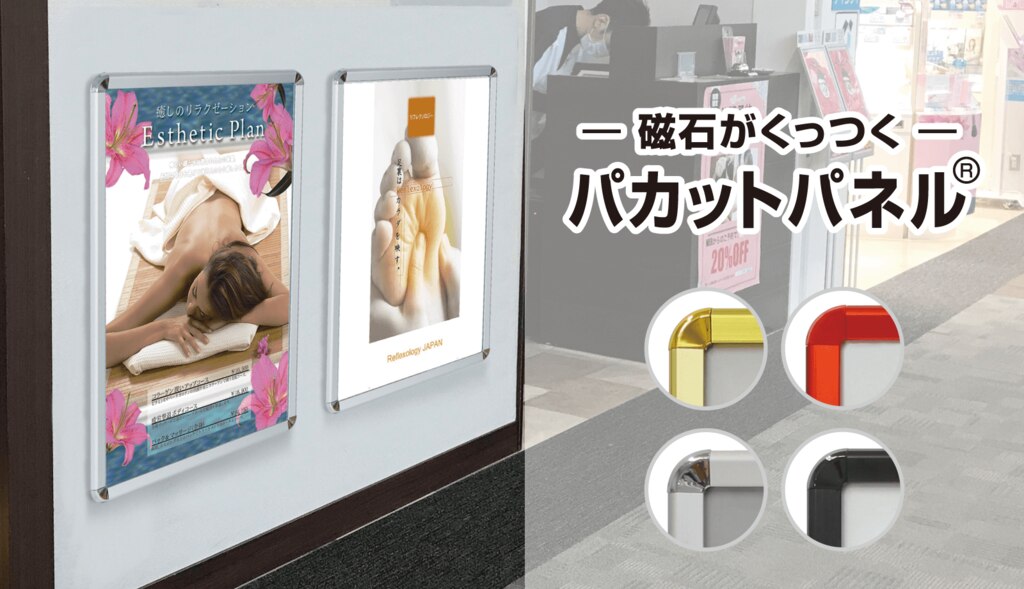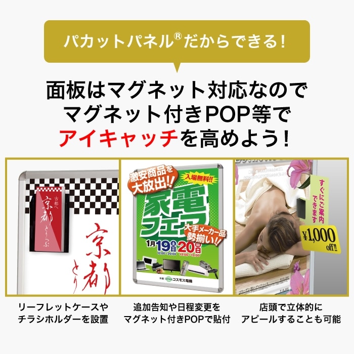 | 備考 | 屋内専用 片面 マグネット対応 4辺開閉式 ※パカットパネルは、株式会社インターコスモスの登録商標です。 |
