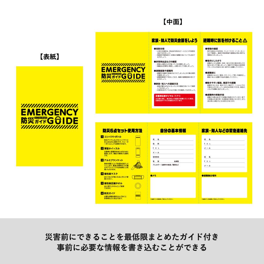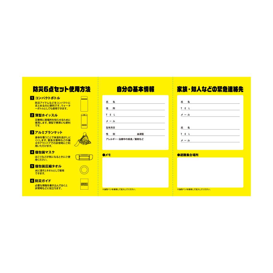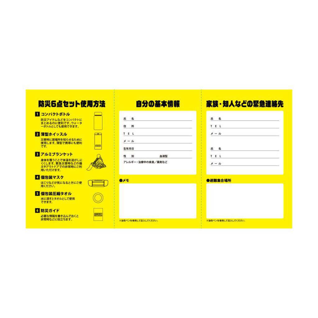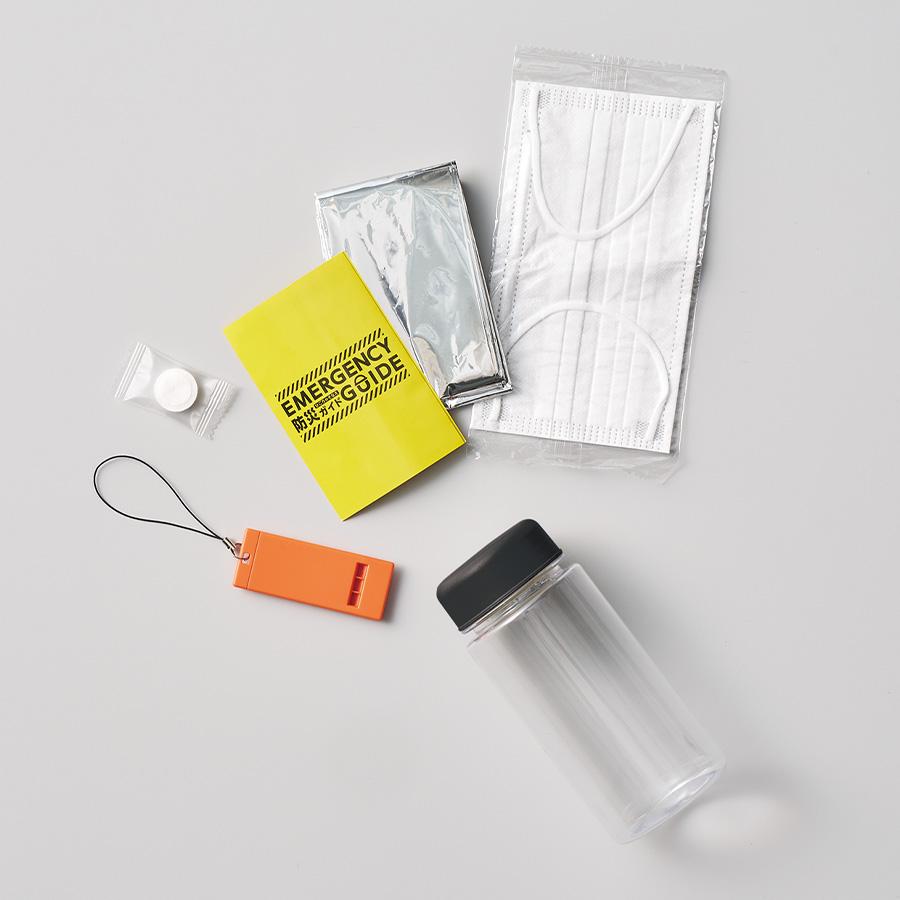 アルミブランケット×1/薄型ホイッスル×1/マスク×1/圧縮タオル×1/ボトル×1/防災ガイド