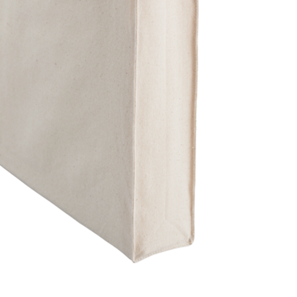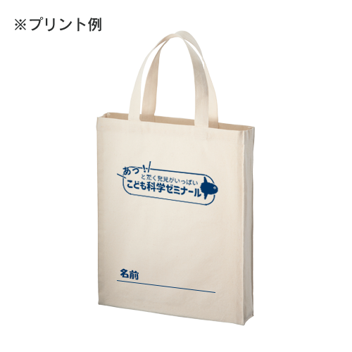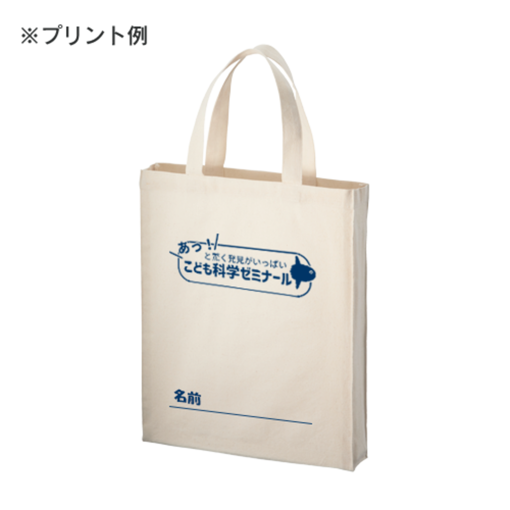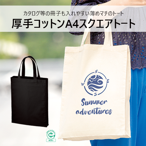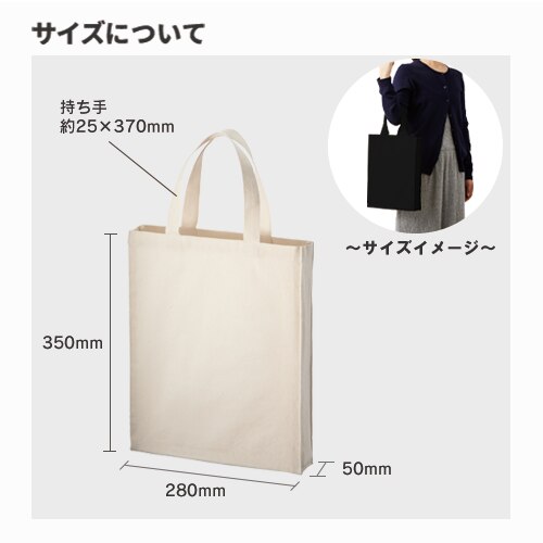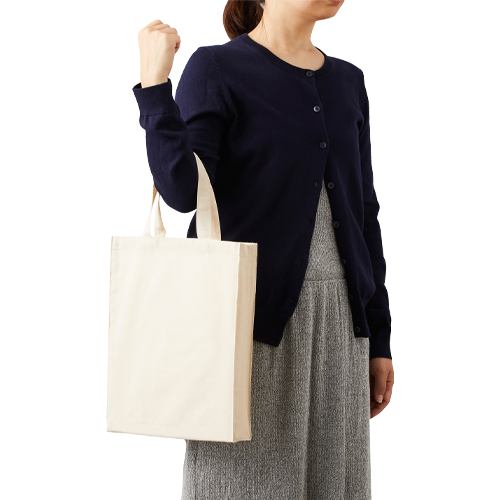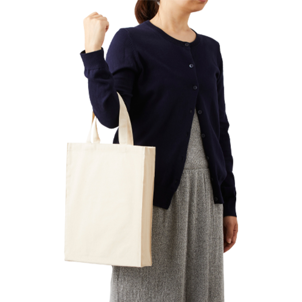 5オンスのバッグシリーズに縦型のスクエアトートが登場しました。約50mmのマチがついており、A4サイズが入るので展示会でのカタログ配布用のバッグとして人気のあるデザインです。通勤・通学時のサブバッグとしても使い勝手の良いサイズ感となっております。カラーはナチュラルとブラックの2色からお選びいただけます。パンフレットなどの資料を配布するオープンキャンバスやセミナーのノベルティとしておすすめです。