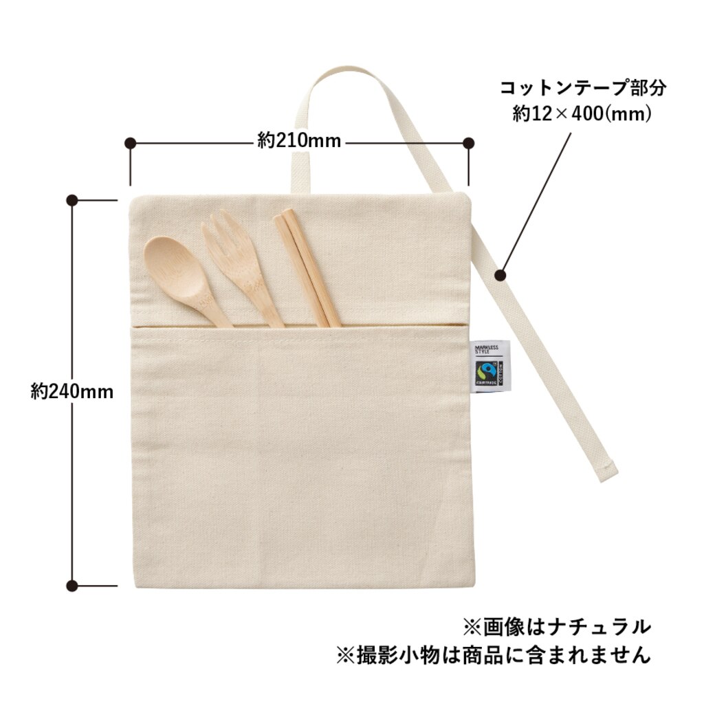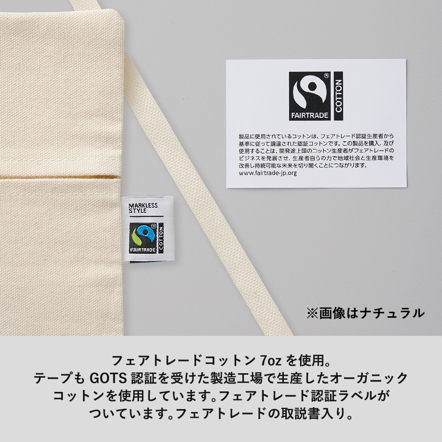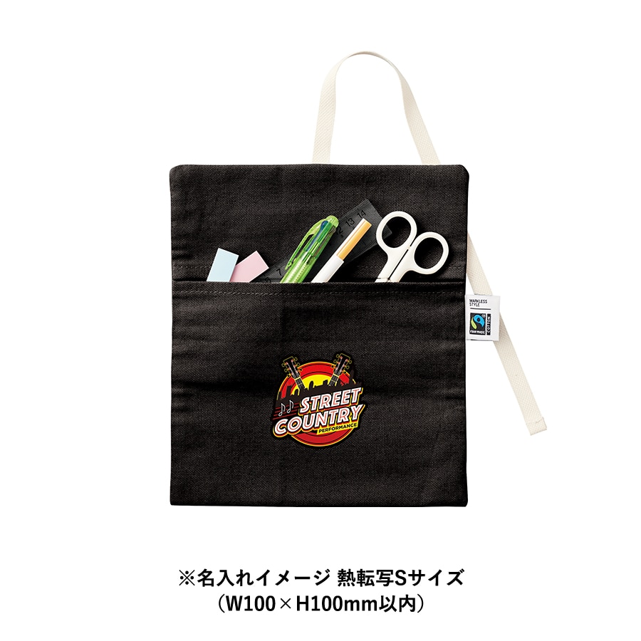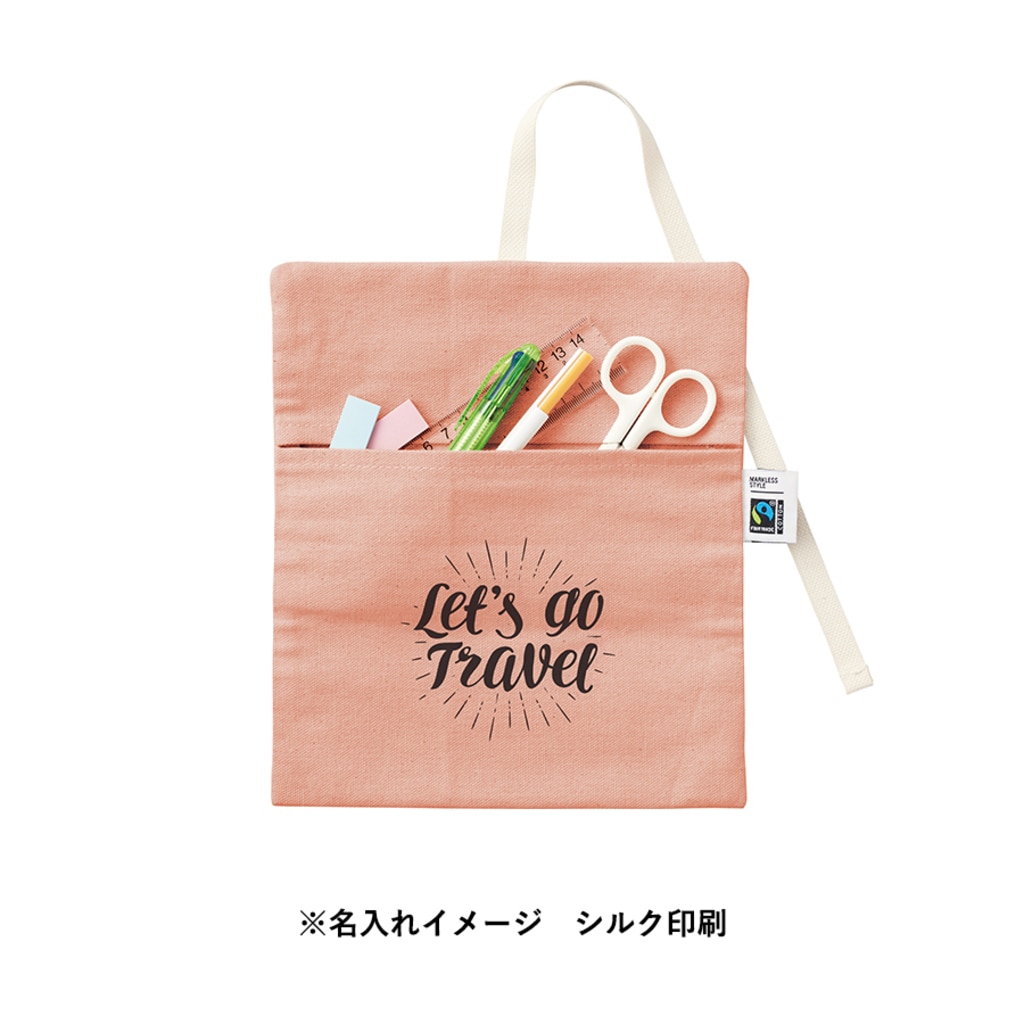 口元はコットンテープで巻いて留めることができるので物が飛び出る心配がありません国際フェアトレード認証ラベル付きのアイテムとなっており、SDGsやサスティナブルへの取り組みで企業価値を高められます。