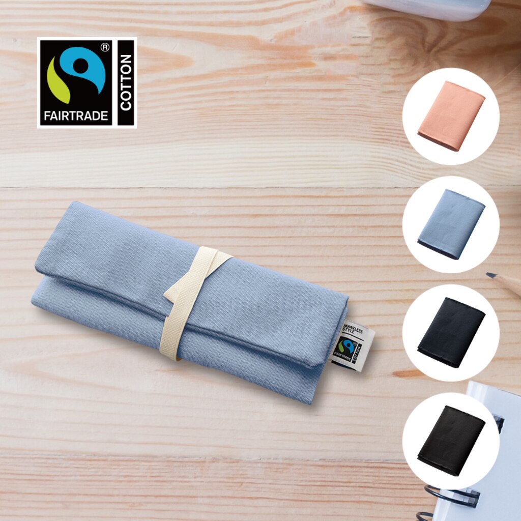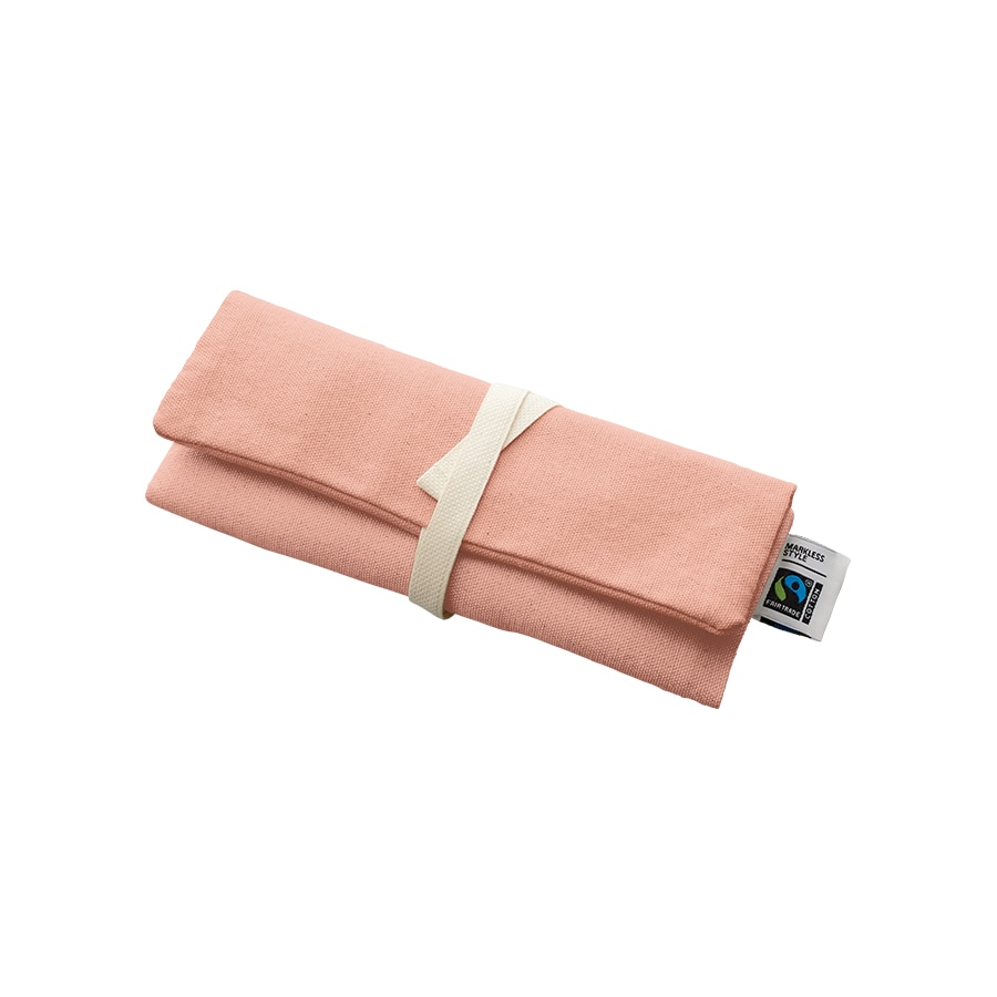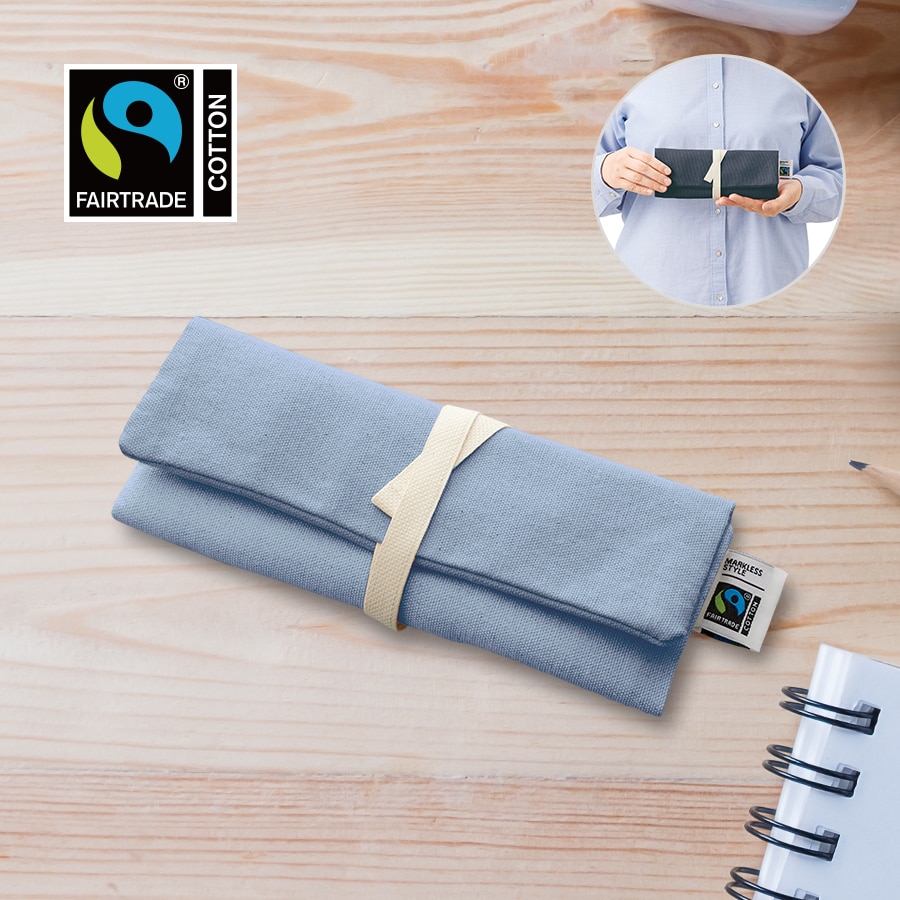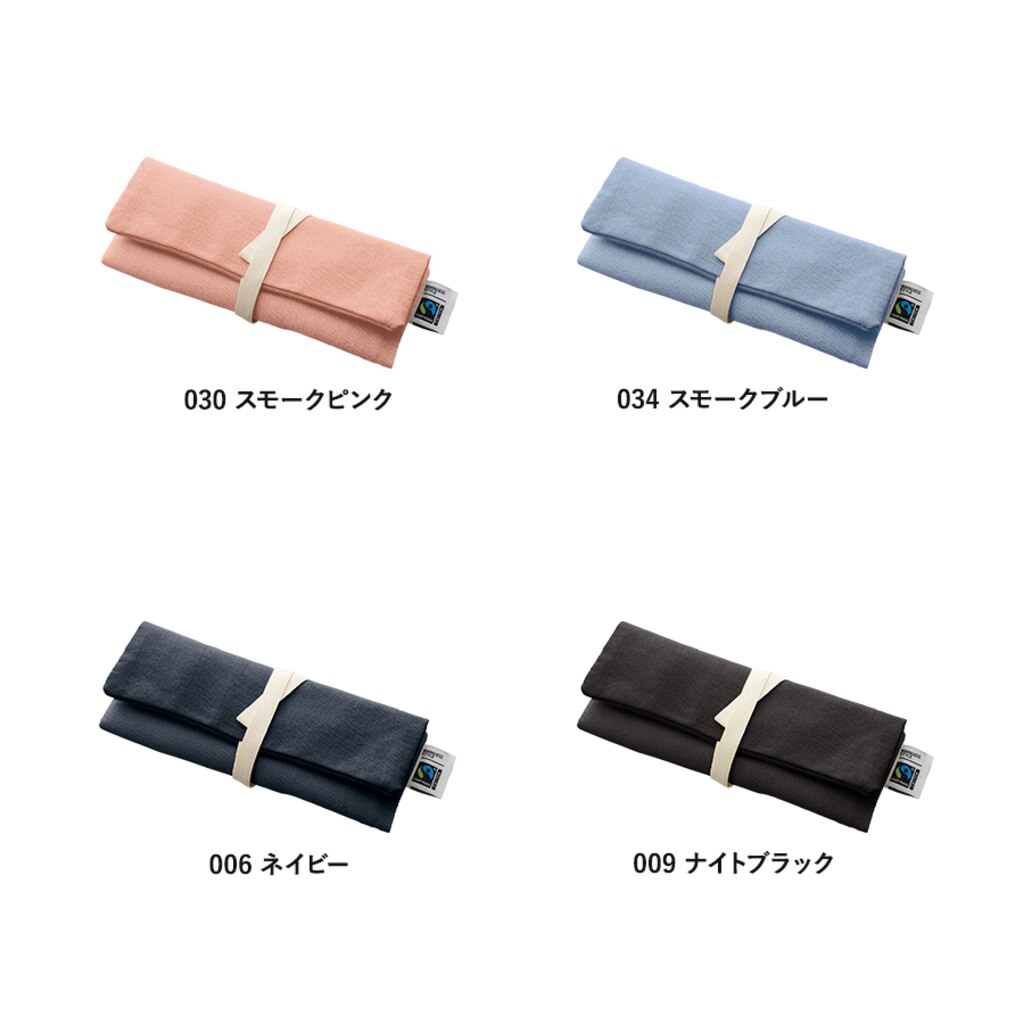 口元はコットンテープで巻いて留めることができるので物が飛び出る心配がありません国際フェアトレード認証ラベル付きのアイテムとなっており、SDGsやサスティナブルへの取り組みで企業価値を高められます。
