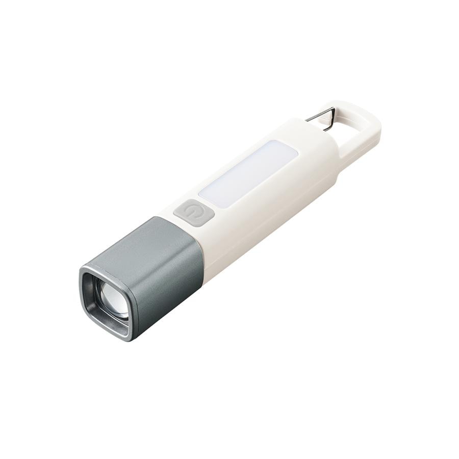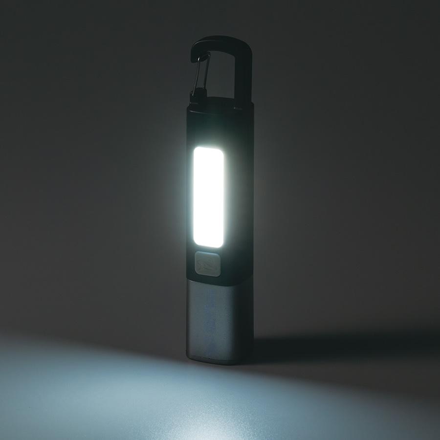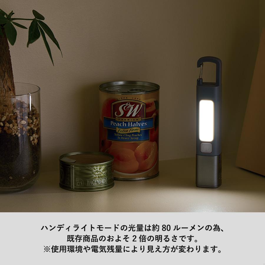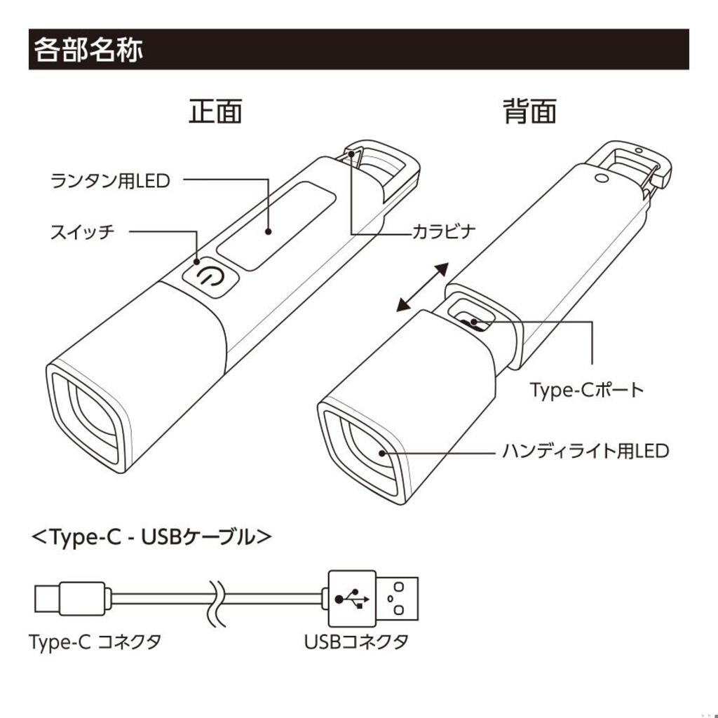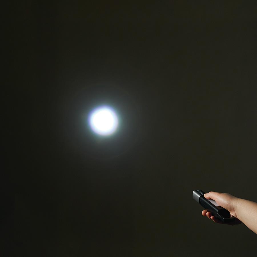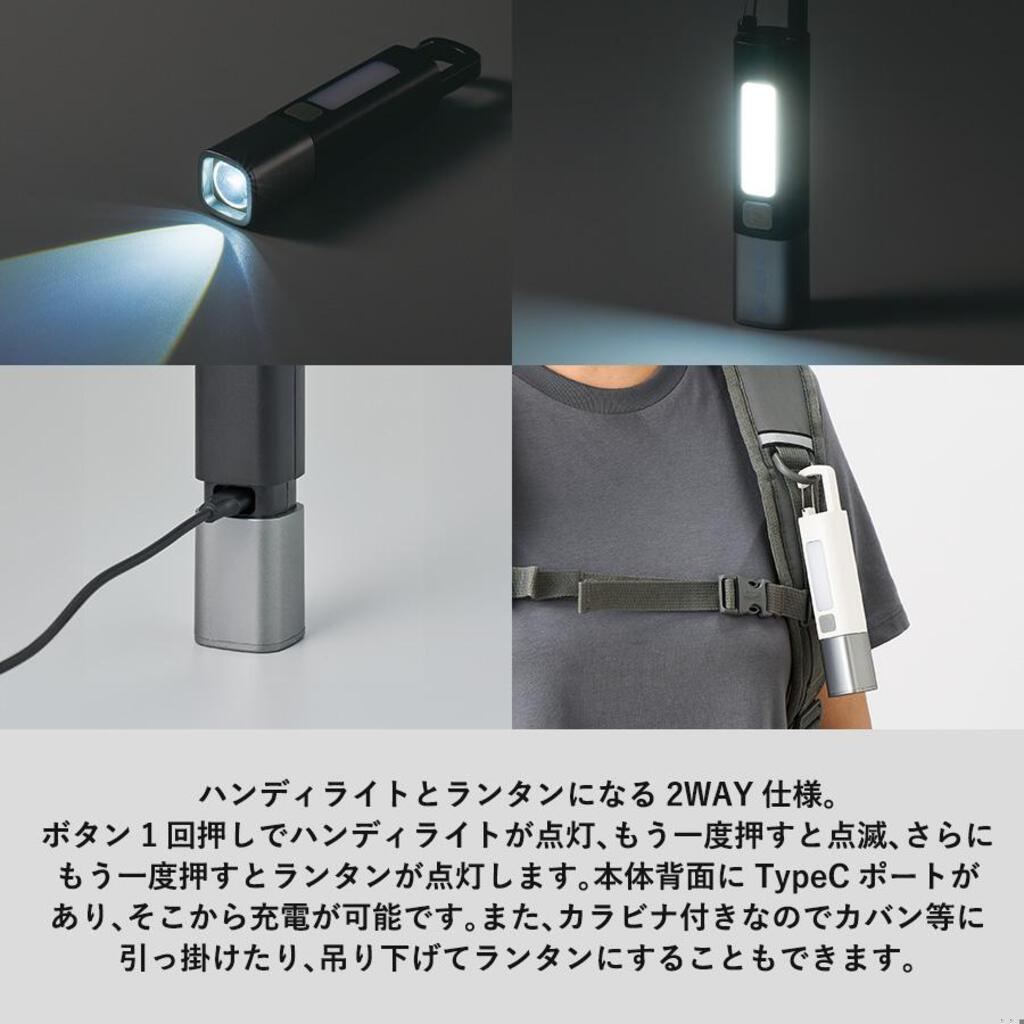 ボタンを1回押すとハンディライトが点灯、もう一度押すと点滅、さらにもう一度押すことで側面のLEDが点灯します。