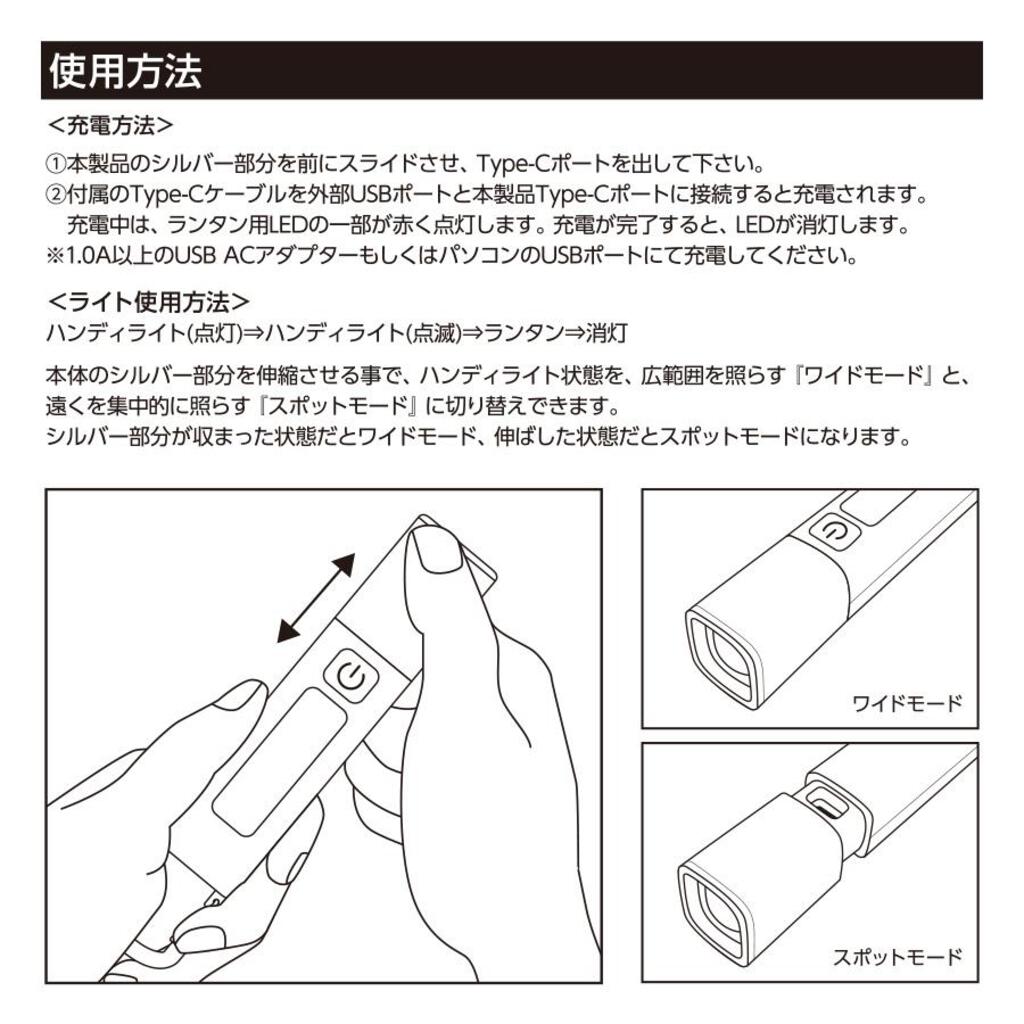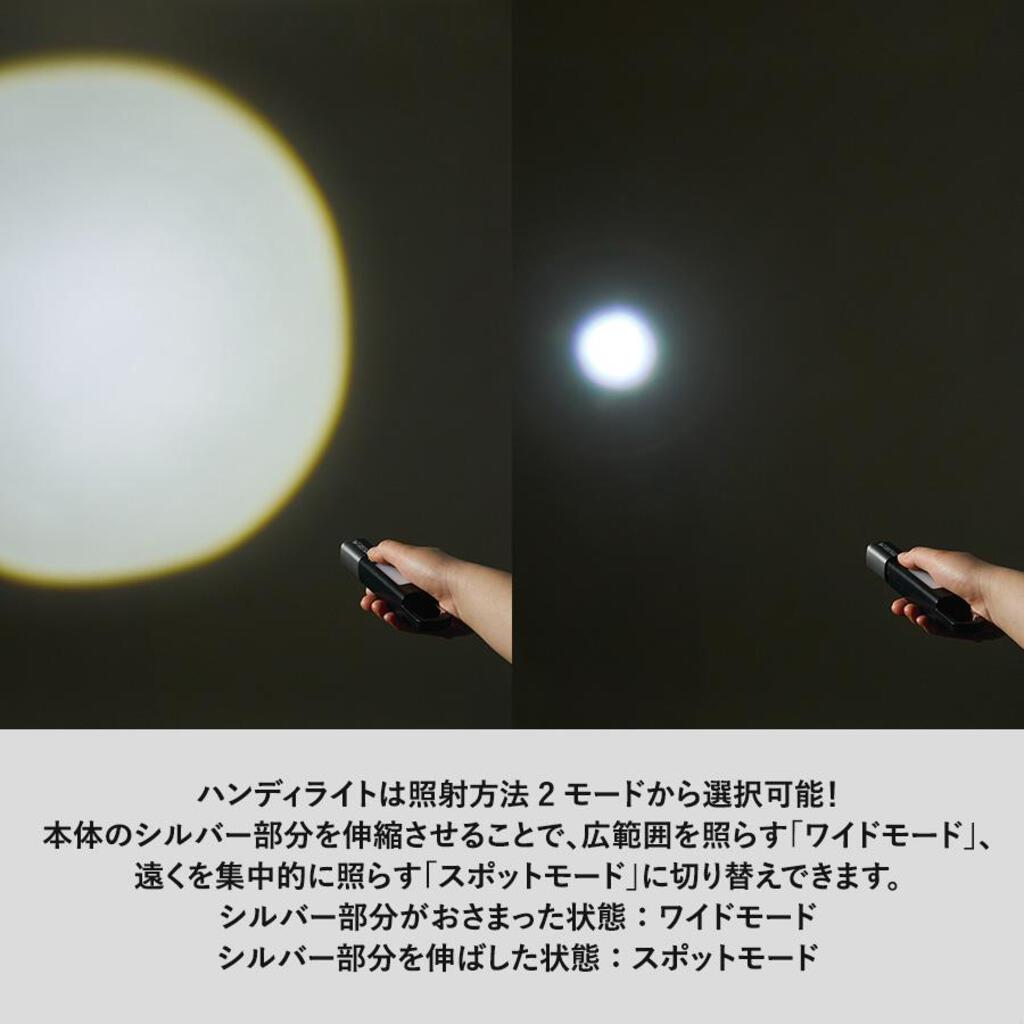 ハンディライトの照射方法は2モードから選択可能でハンディライトの状態でシルバー部分を伸ばすと遠くを集中的に照らす「スポットモード」に、シルバー部分を収めると広範囲を照らす「ワイドモード」に切り替えることができます。