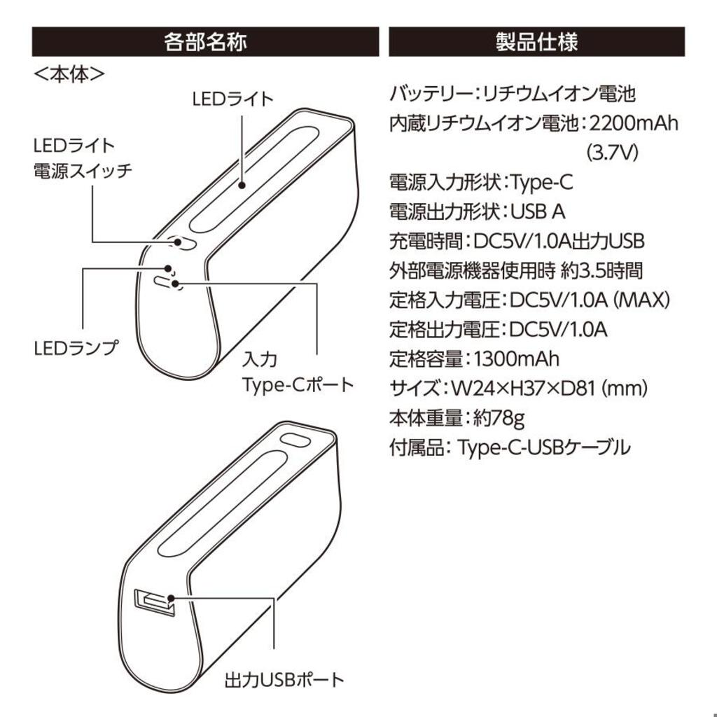 | 備考 | 最大出力1A、バッテリー容量2200mAh、本体重量約78g |