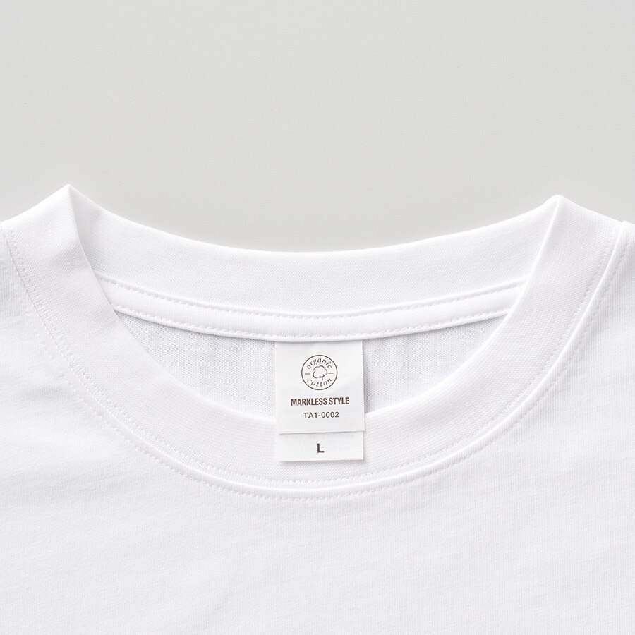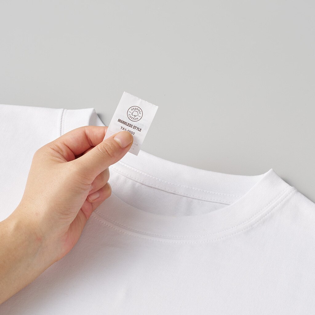 ネームは洗濯表示とブランドネーム(MARKLESS STYLEと記載)の二枚が首元にありますが、手で切り取れる素材になっております。