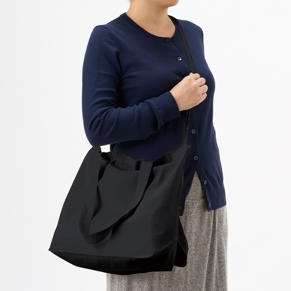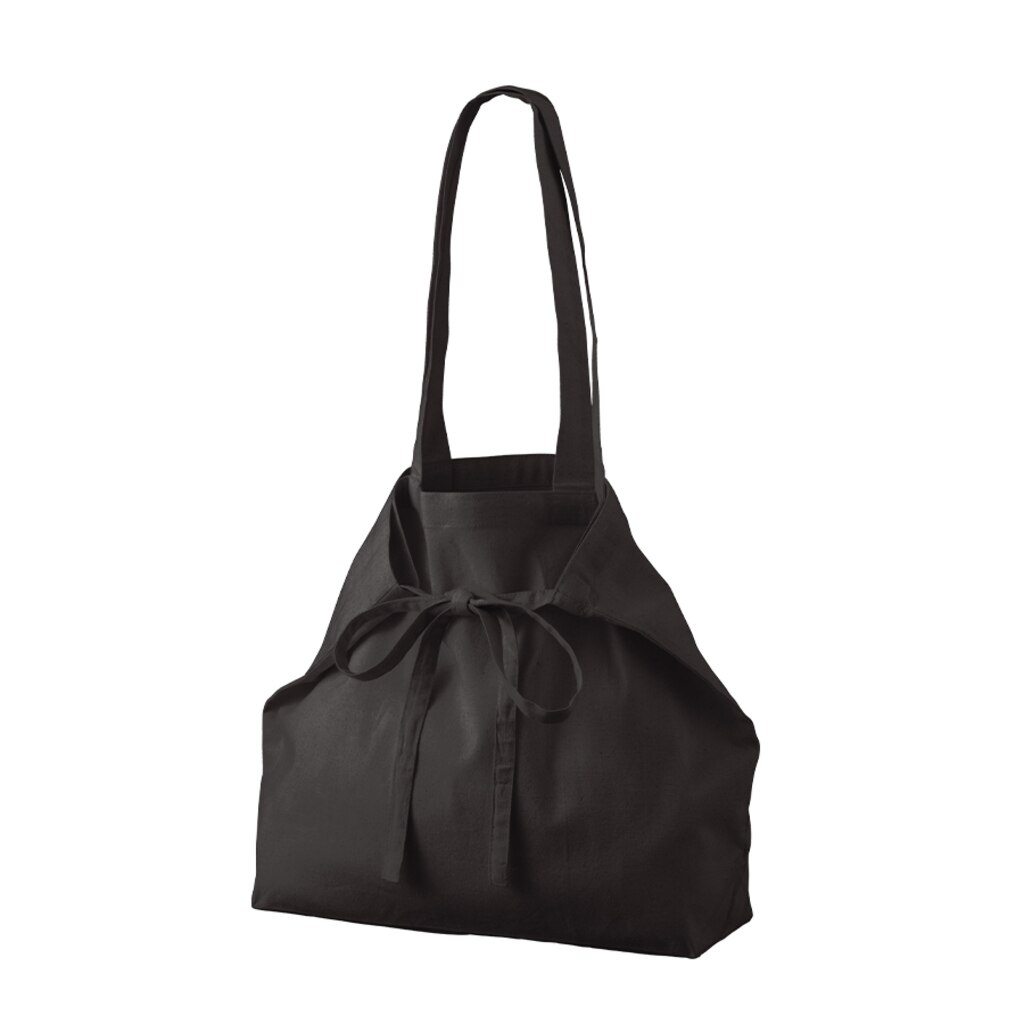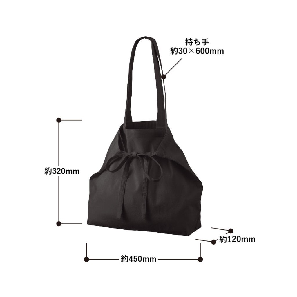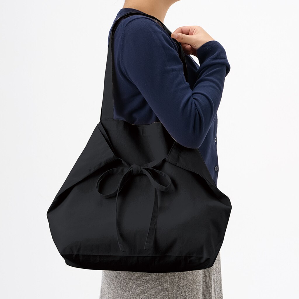 紐を中に結んで台形型バッグに、表でリボンを結んでリボンバッグに、左右の紐の先端を結んでショルダーバッグにと、フォルムを変えながら使用することができます。