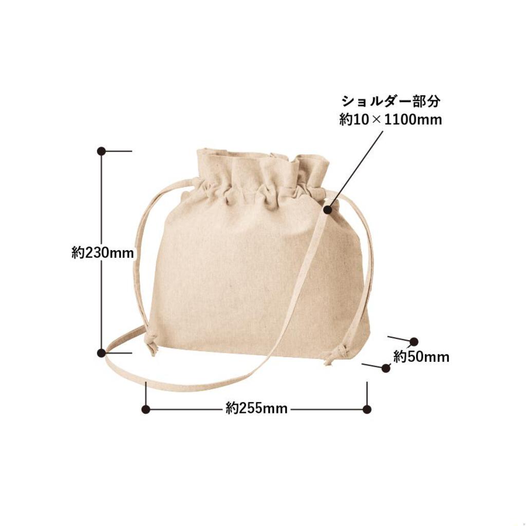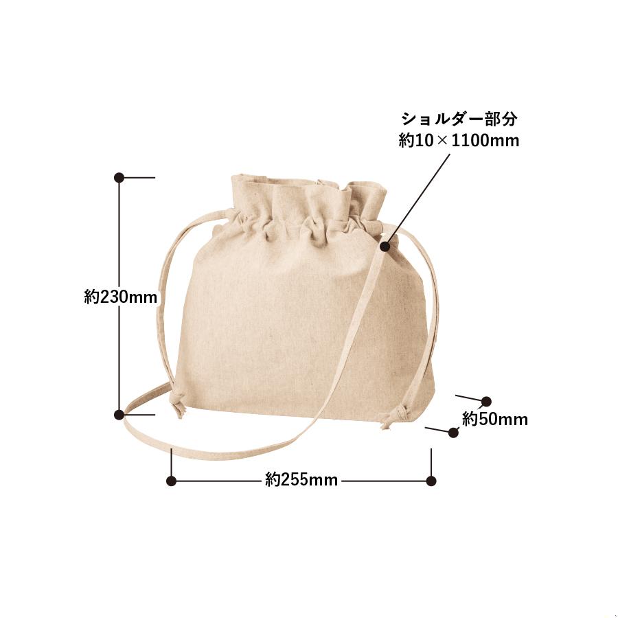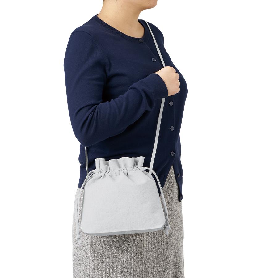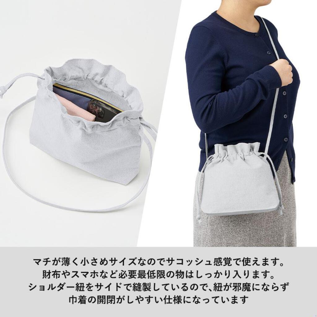 またショルダー紐はサイドで縫製しているので、紐が邪魔にならずに、巾着の開閉がしやすいような仕様です。